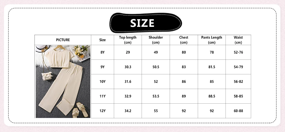 Size:12Y/Top Length:34.2/Shoulder:55/Chest:92/Pants Length:92/Waist:60-88