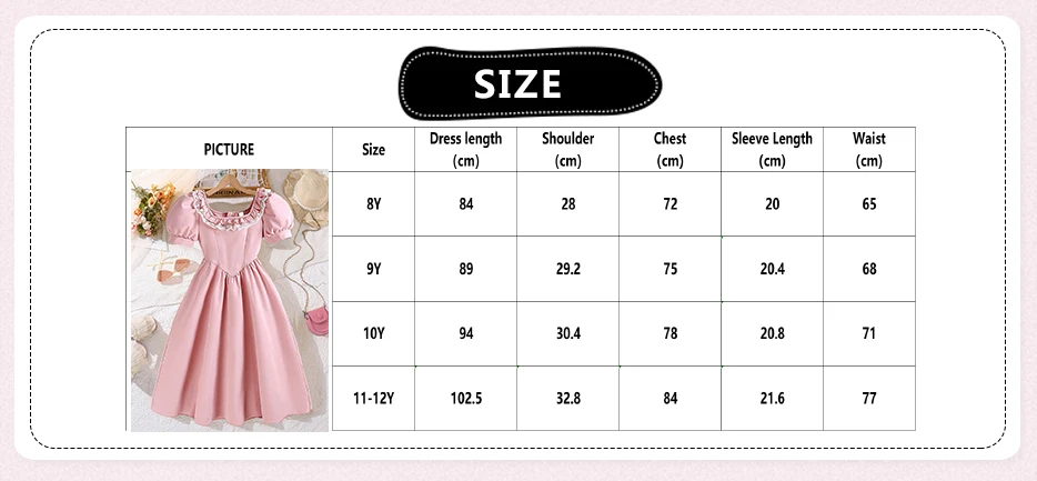 Size:8Y/Dress Length:84/Shoulder:28/Chest:72/Sleeve Length:20/Waist:65
